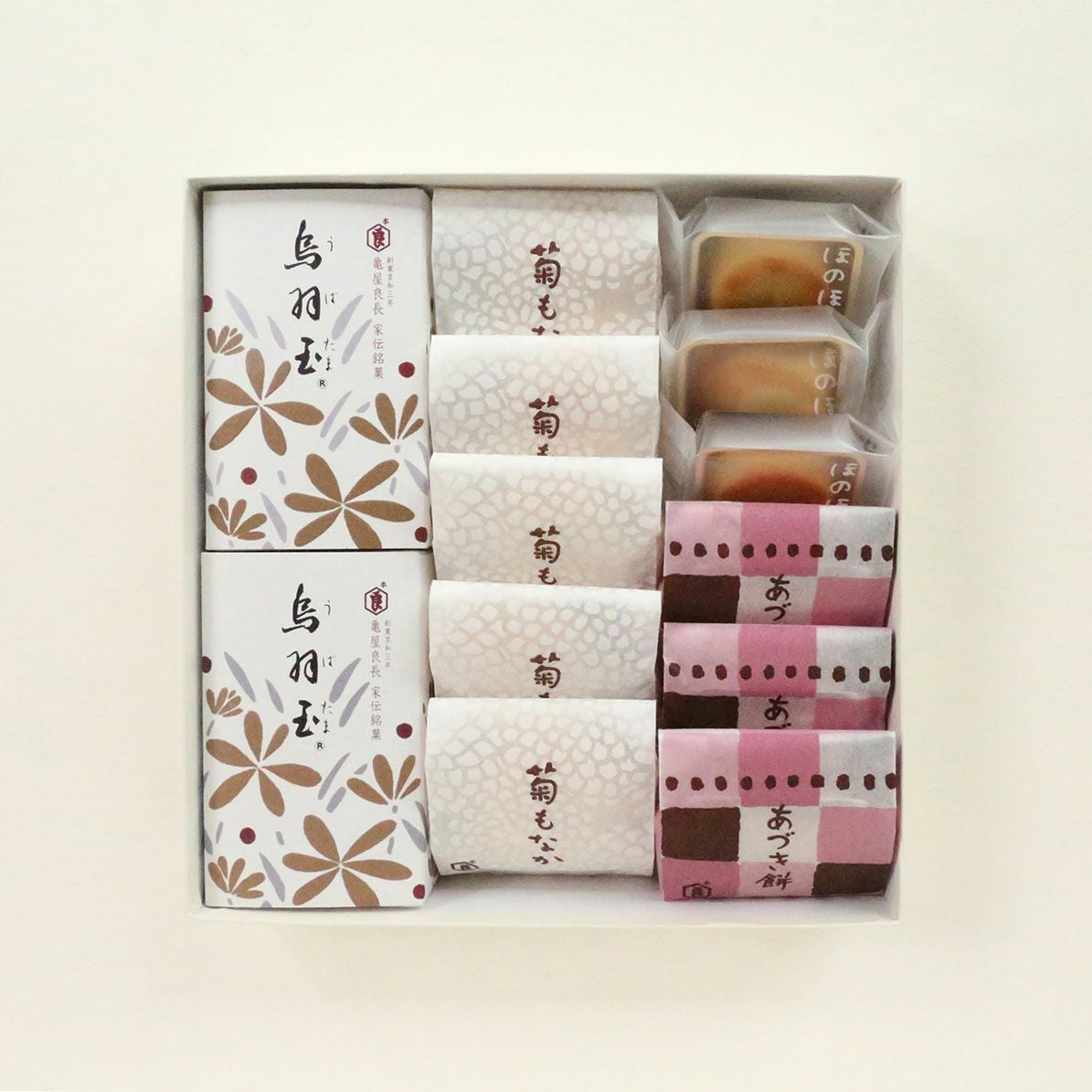 代表銘菓「烏羽玉」「菊もなか」「あづき餅」「ほのほの(チーズレモン)」の詰合せです。