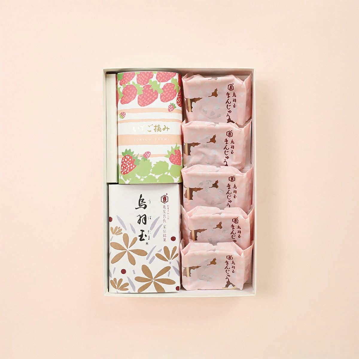 代表銘菓「烏羽玉」と、春限定の「いちご摘み」、「烏羽玉まんじゅう〈さくら〉」を詰合せました。
