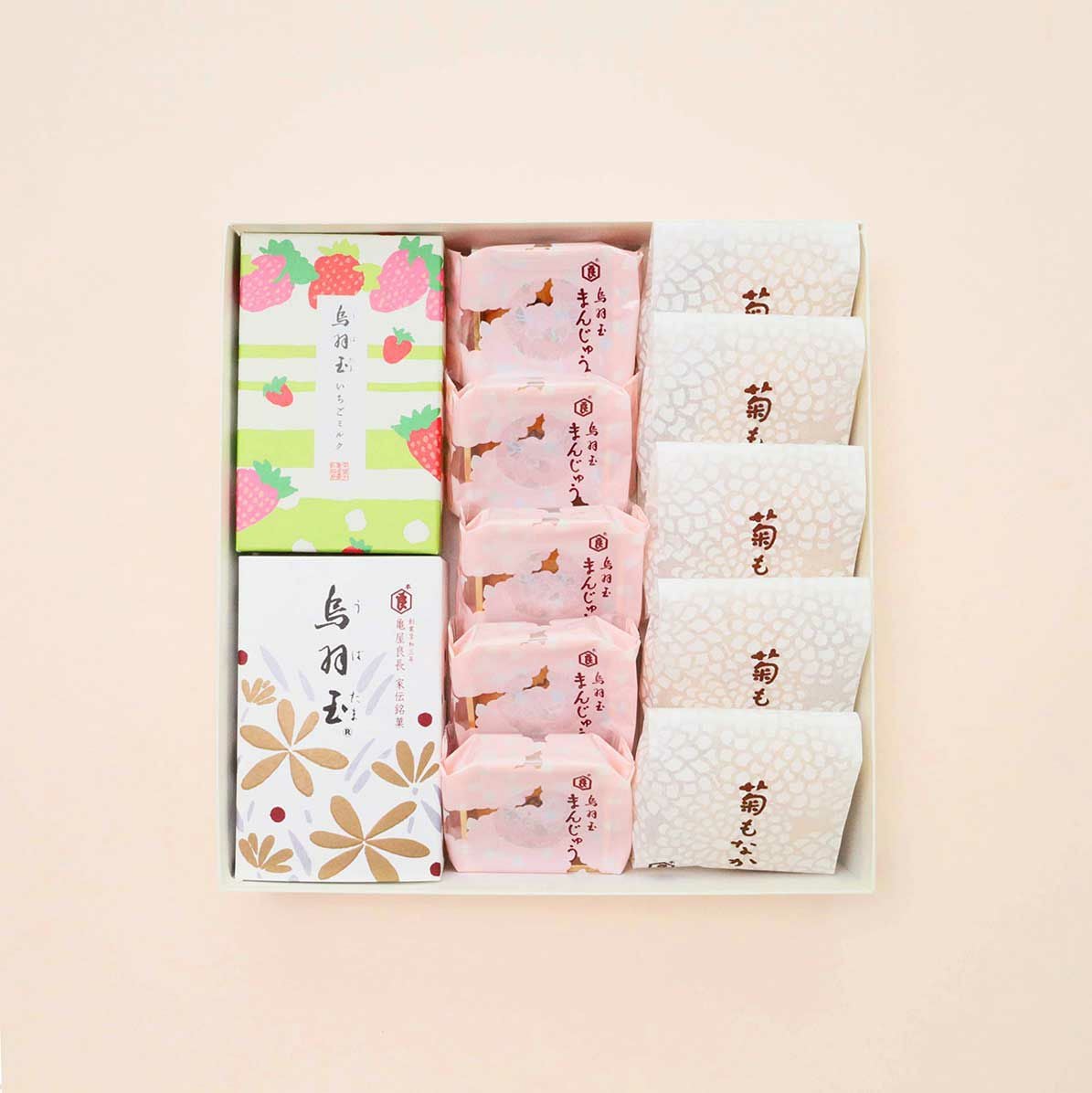代表銘菓の「烏羽玉」と「菊もなか」、春限定「烏羽玉〈いちごミルク〉」「烏羽玉まんじゅう〈さくら〉」の詰合せです。
