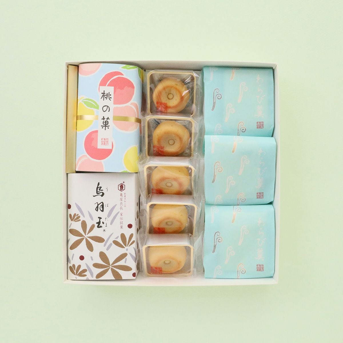 代表銘菓の「烏羽玉」と、季節限定「桃の菓」「満々」「わらび羹」の詰合せです。