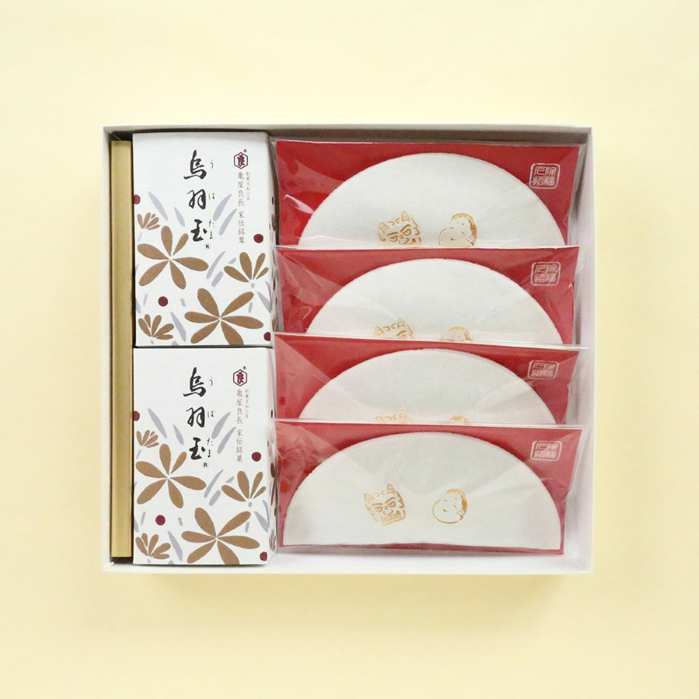 代表銘菓の「烏羽玉」に、季節限定の「厄除招福しるこ」を詰合せました。