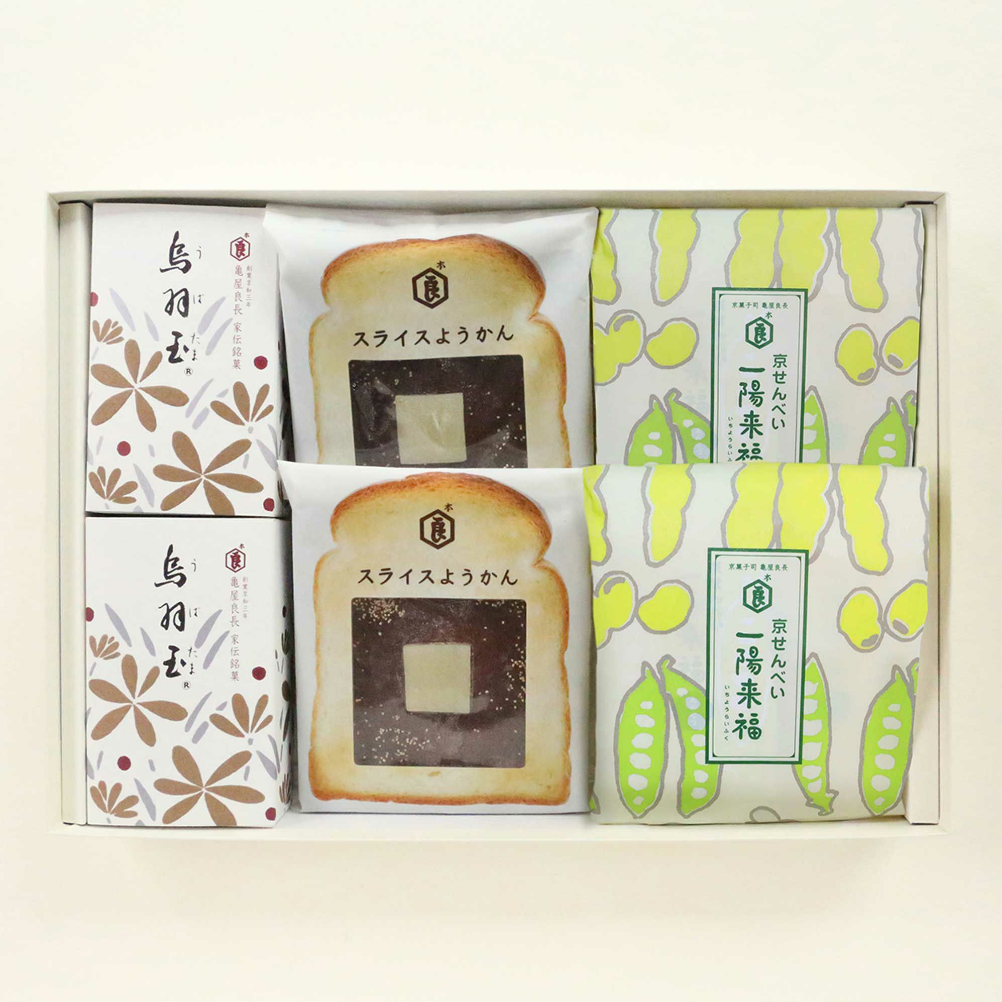 代表銘菓「烏羽玉」と人気の「スライスようかん」、「一陽来福」の詰合せです。