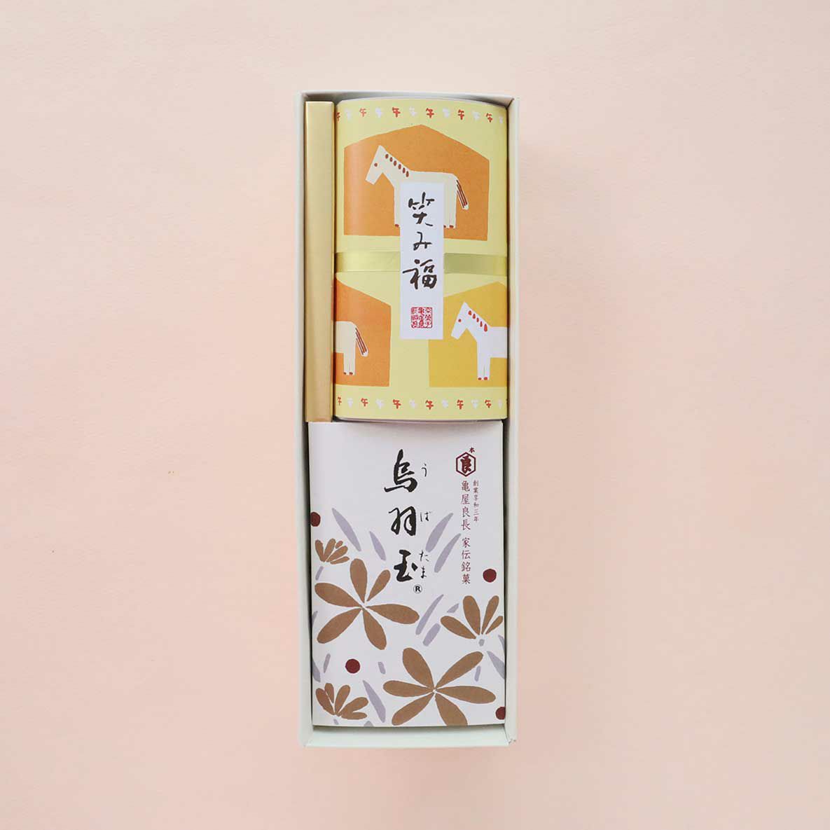 代表銘菓の「烏羽玉」と、迎春菓「笑み福」の詰合せです。