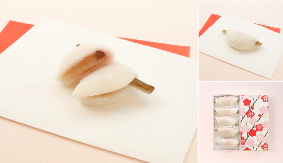 ほんのり紅色が透ける羽二重餅で、白みそ餡と 柔らかく蜜づけしたごぼうを包みました。 新年ならではの、おめでたいお菓子です。