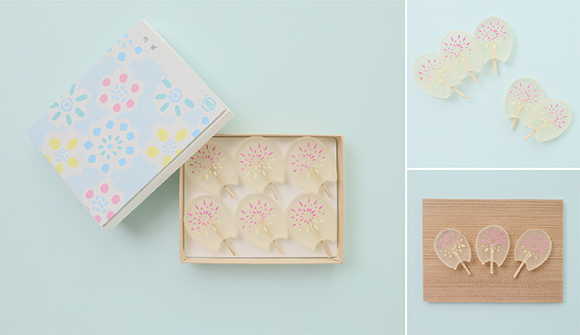 うちわをかたどった琥珀糖に、華やかな花火を描きました。
