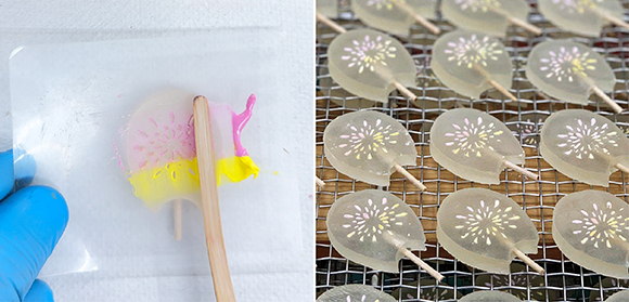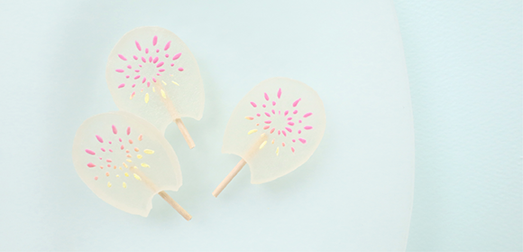 琥珀糖は、ひとつひとつ手作業でお作りしております。 うちわのかたちに型抜きしたら爪楊枝を差し込み、乾燥させます。花火の絵柄は、刷り込み(ステンシルのような技法)で、職人が丁寧に絵付けしています。刷り込みの型も職人のお手製です。綺麗なグラデーションになるように、色合いにもこだわりました。 一枚一枚少しずつ表情が異なるところも、手作りならではの風合いに。