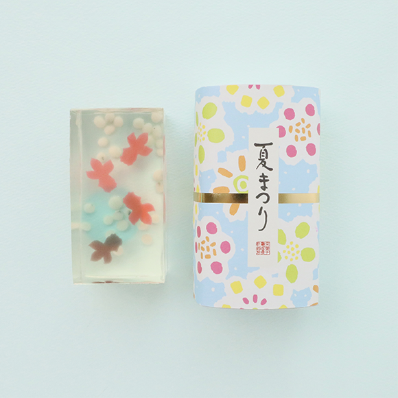 錦玉羹の中に金魚が泳ぐ、涼やかな夏の棹物です。暑い日は、冷やしてお召し上がりいただくのもおすすめです。