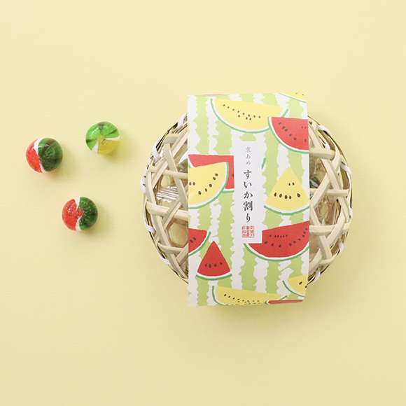 すいかの姿が愛らしい京あめを、竹かごにお詰めしました。夏のちょっとしたお手土産に。