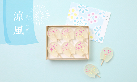 手のひらサイズの小箱を開けると、かわいらしいうちわ型の琥珀糖が並びます。見た目にも涼やかで、シャリッとした食感が爽やかな琥珀糖は、お茶請けにもおすすめ。SOU・SOUのメッセージカード付きですので、ひとこと添えてお贈りすることもできます。