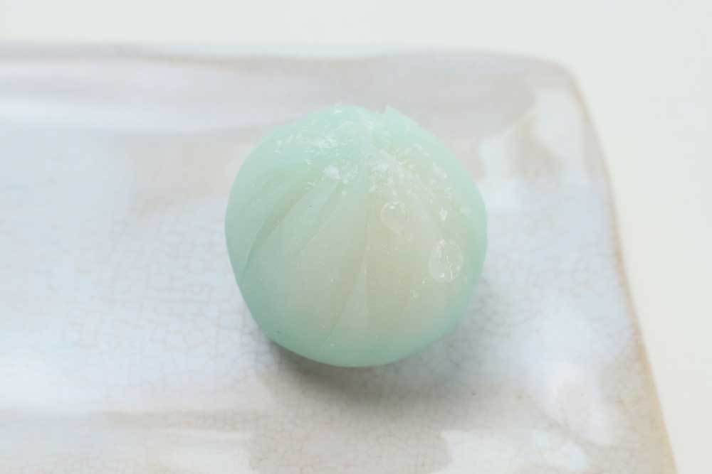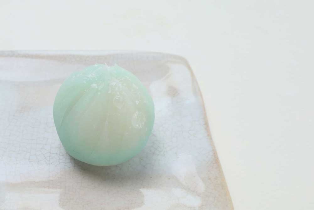 冷たく、透き通った水を外郎のぼかしで表現し、上部に散らした氷餅は霜を、錦玉羹で雫をあしらいました。