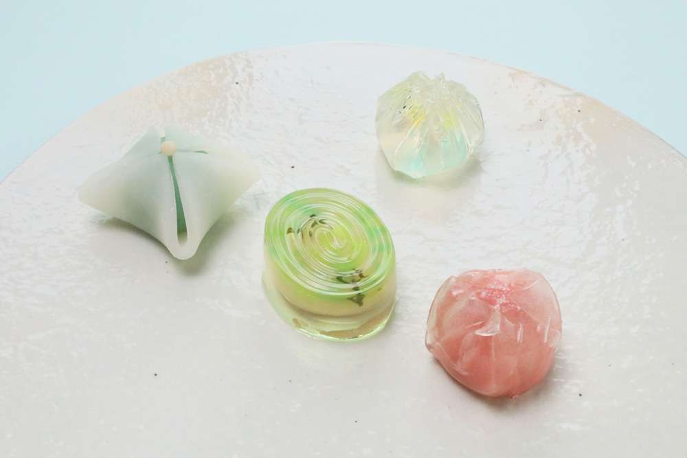 「食べられるエメラルド」ともいわれる野菜、「蓴菜(じゅんさい)」を、生姜あんとともに錦玉羹で包みました。