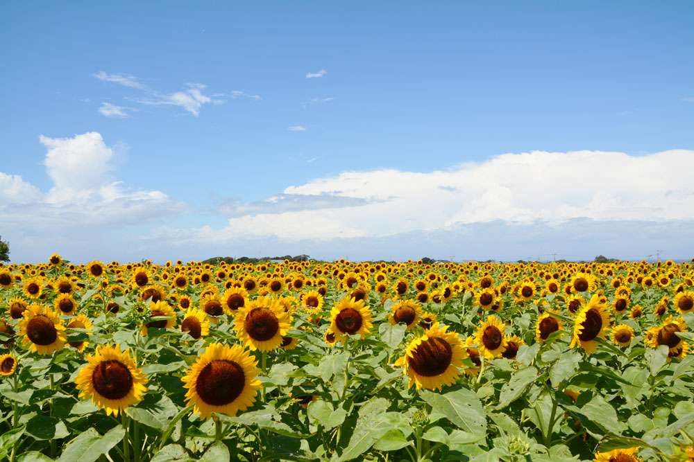 ひまわりは、成長期に太陽を追うように回ることから「日廻り」と名付けられ、のちに「向日葵」となりました。ひまわりの花自体も太陽のような存在感で、見ていると元気を分けてもらえるような気がいたします。