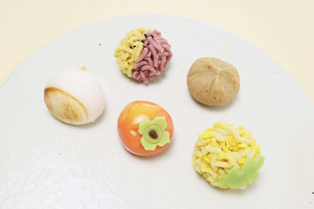 柿の果肉を混ぜ合わせた白あんを練り切りで包み、寒天をかけて、つややかに仕上げました。