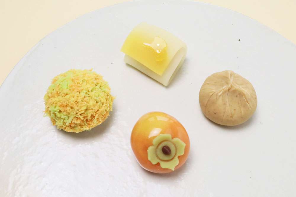 柿の果肉を混ぜ合わせた白あんを練り切りで包み、寒天をかけて、つややかに仕上げました。