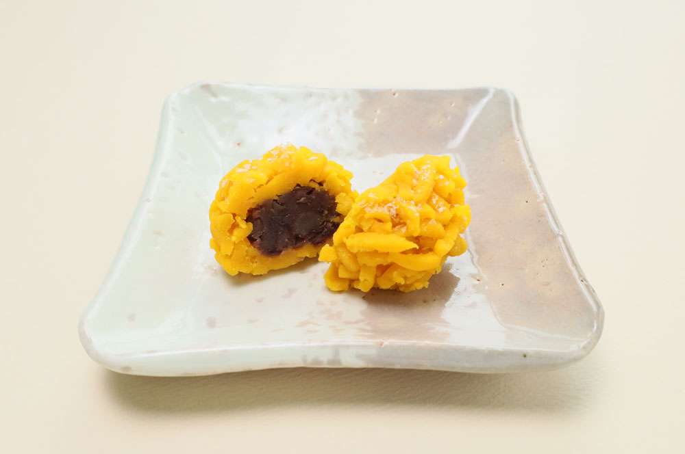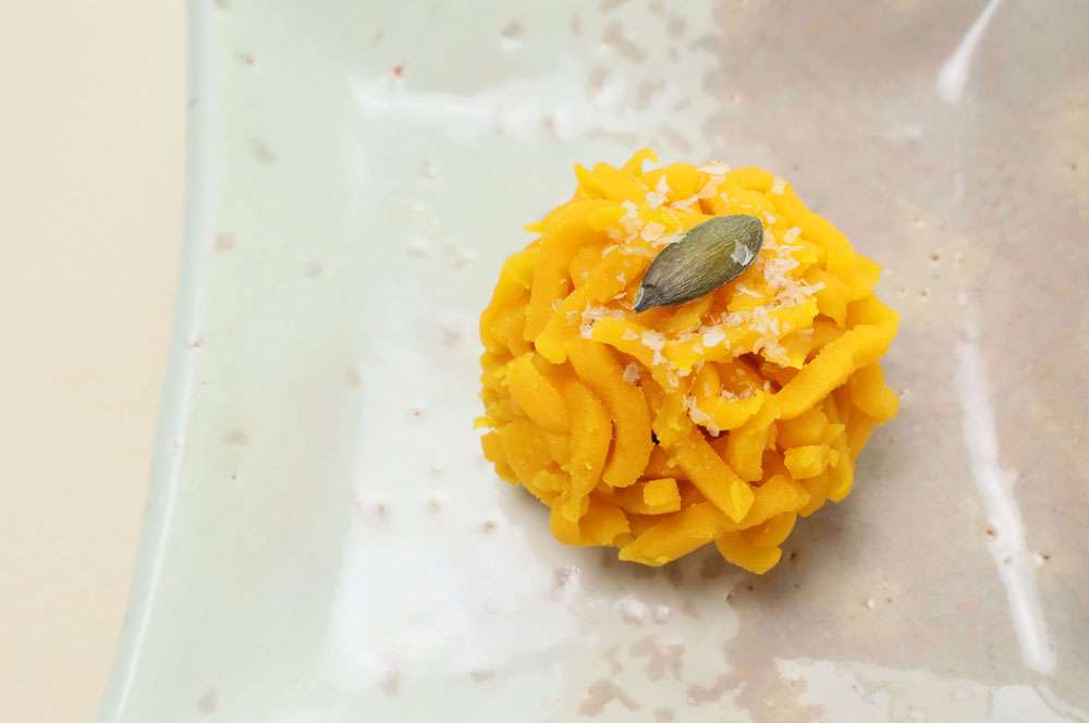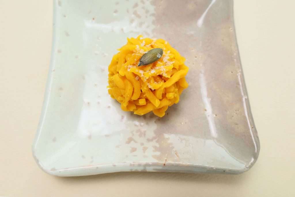 かぼちゃペーストを合わせたきんとん餡で、丹波大納言小豆の粒餡を包み、かぼちゃの種をあしらいました。仕上げに、初霜をイメージした氷餅をふわりとまぶしています。