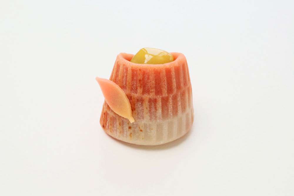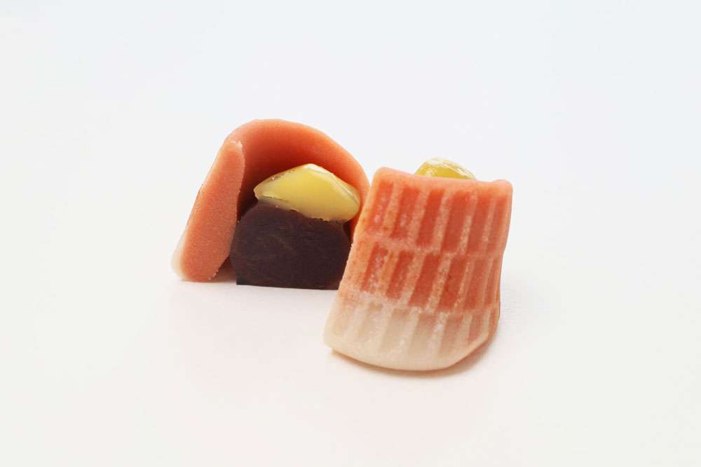 外側は表面を炙った練切。雪を表した白のぼかしを入れました。