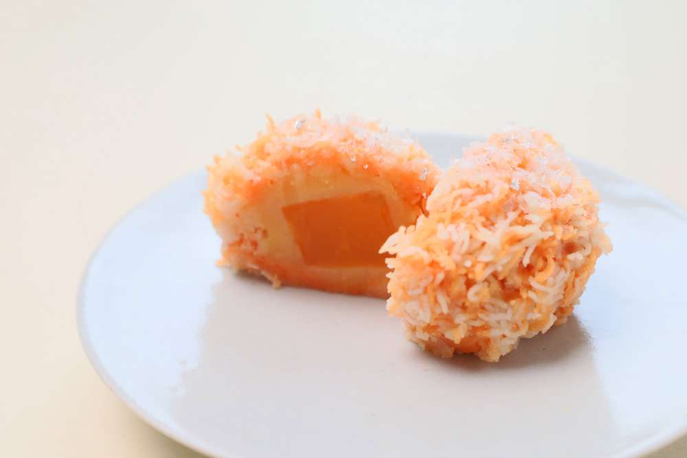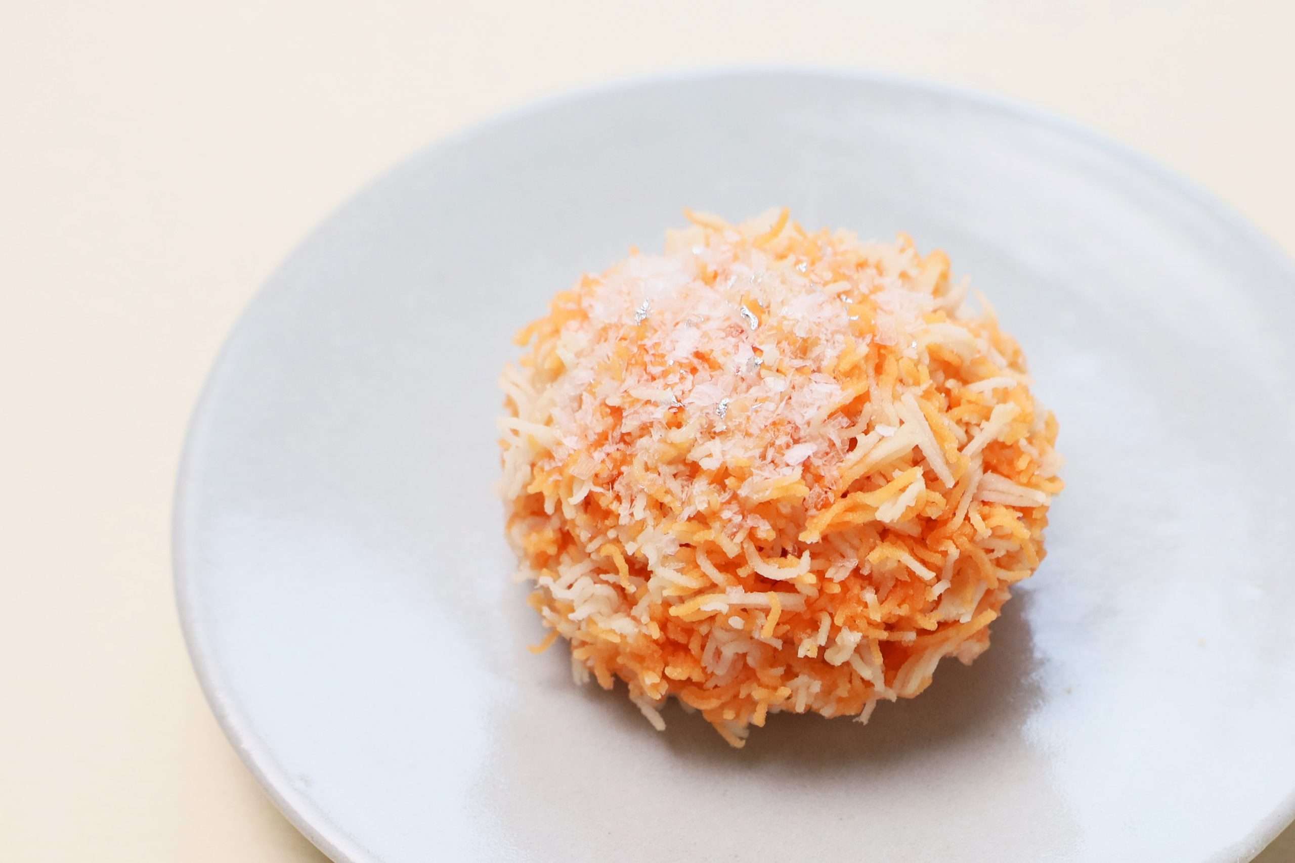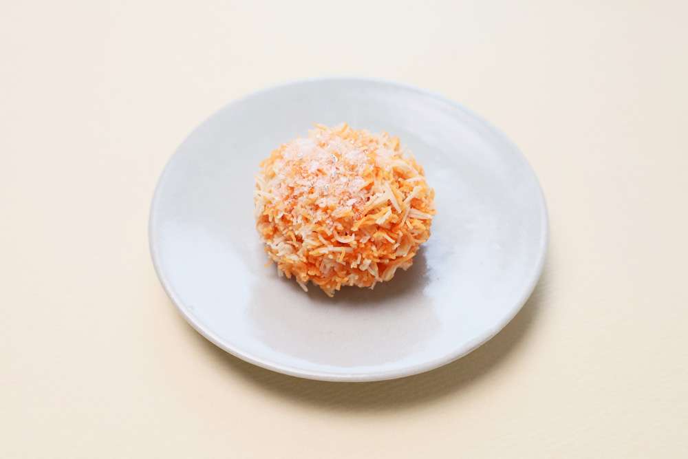 外側のきんとんは、蜜柑色に染め上げた繊細なそぼろで、ふわりとした積雪の風合いを醸し出しております。内側には爽快な香りを閉じ込めた蜜柑餡、さらにその中心には蜜柑ゼリーを入れており、柑橘の優しい甘さと酸味の両方を感じられます。