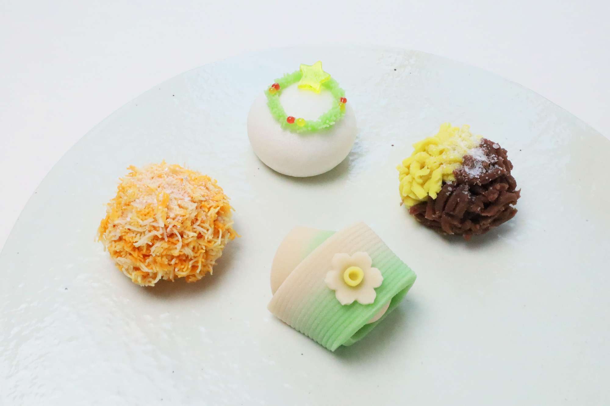 上用まんじゅうの上に、繊細なクリスマスリースをあしらいました。